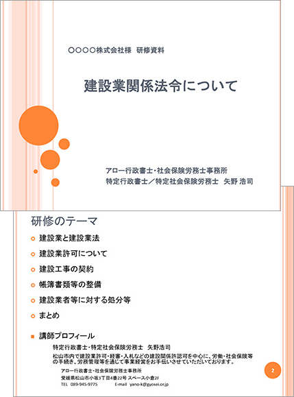 当事務所では、建設業関係業務を長年に渡り数多く取り扱わせていただいた実績と経験をもとに、正しい法令理解とその対応、建設業事業運営のためのアドバイス、担当される社員様に対する研修など、各種コンサルティング業務も行っております。
